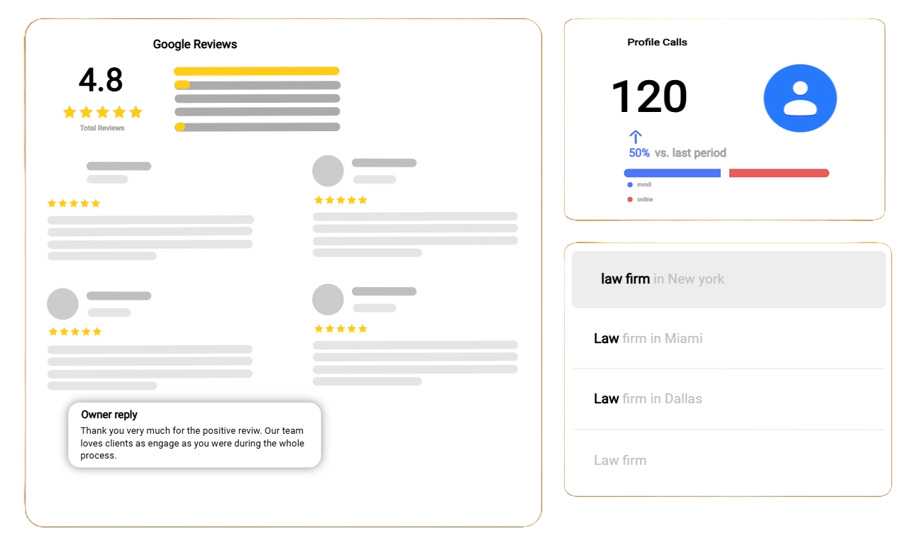 We implement strategies to generate authentic, keyword-rich reviews, critical for law firms where trust is everything. We also help address negative reviews appropriately.